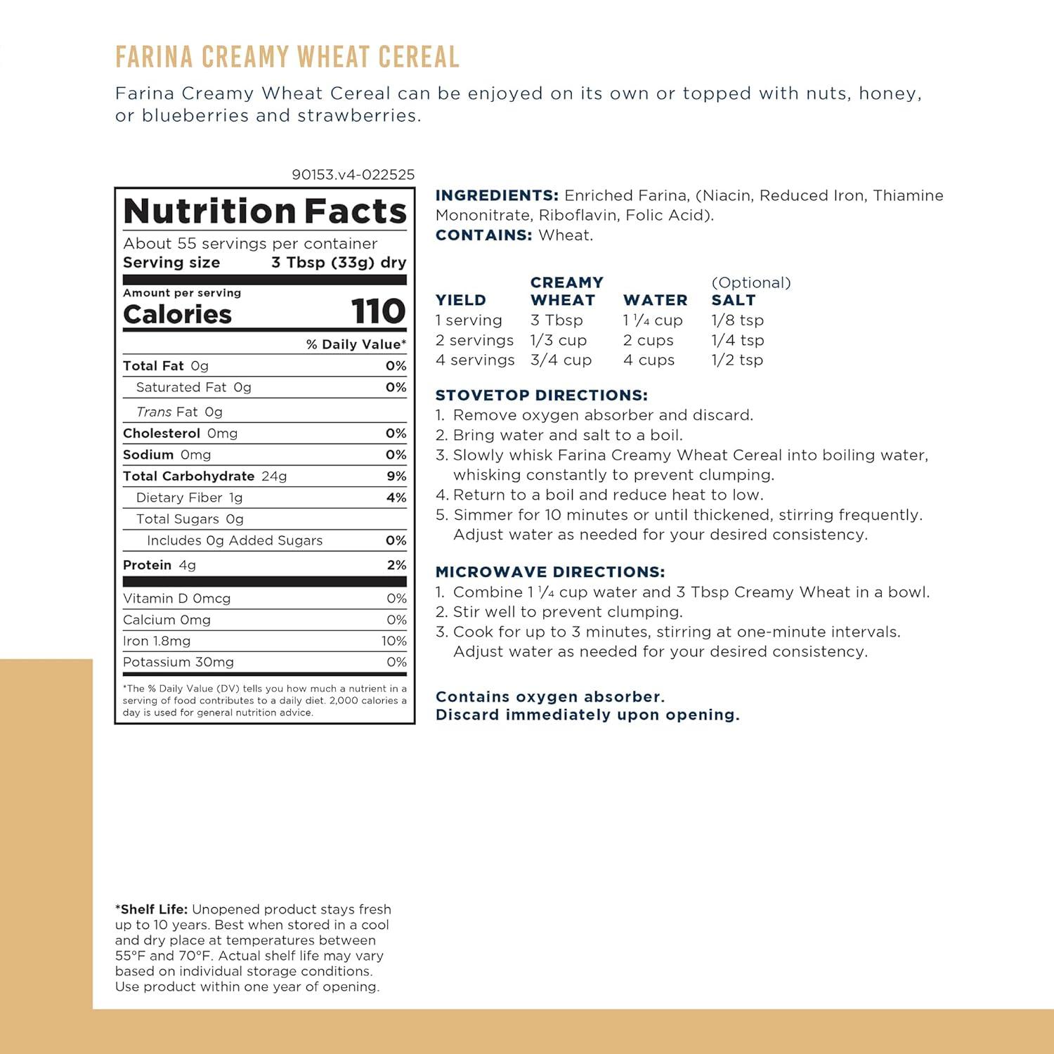 LONG SHELF LIFE PANTRY STAPLES – Designed for long term storage in your kitchen, camping supplies, or emergency rations kit, this creamy wheat cereal can has 55 servings and has a 10-year shelf life